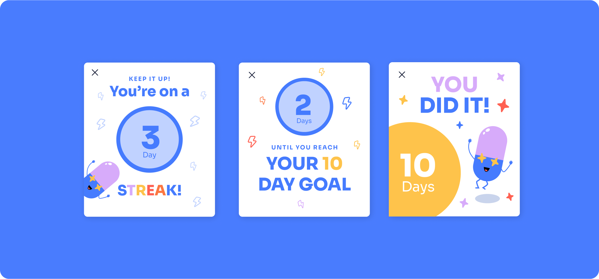 With the branding in place, the high-fidelity wireframes bring the experience to life. The screens now reflect the friendly, approachable tone of the brand, with soft colors and playful illustrations. I added encouraging notification pop-ups to help users stay motivated and continue meeting their goals. Small habit-building features, like linking medications to daily routines and noting where they’re stored, support lasting, consistent use.